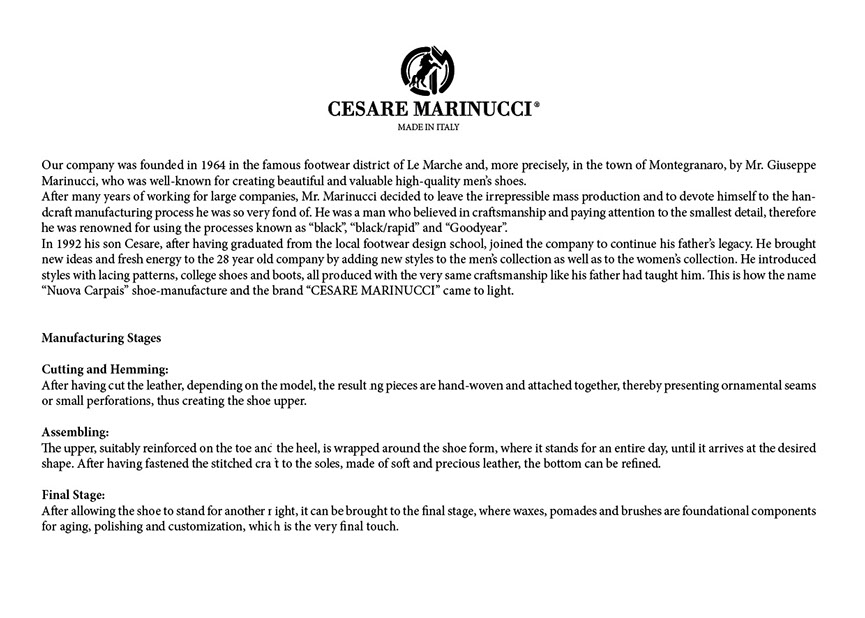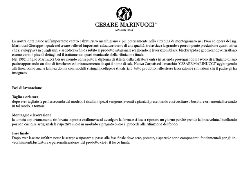 Calzaturificio Nuova Carpais di Cesare Marinucci Tel: +39-0734-891993 Cell: +39-335-6179075 info@cesaremarinucci.it Via A. Mameli, 5 63812 Montegranaro (FM) Italy - P.Iva 01376850440